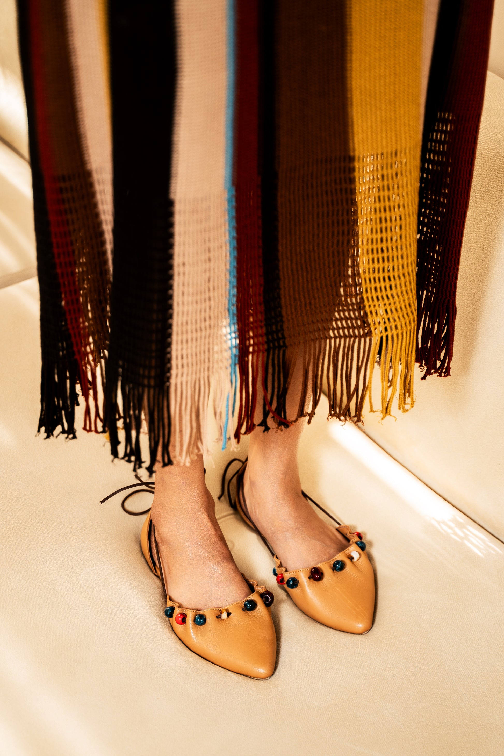 A warm tan leather handcrafted flat finished with hand-strung glossy beads and ruffled edging.