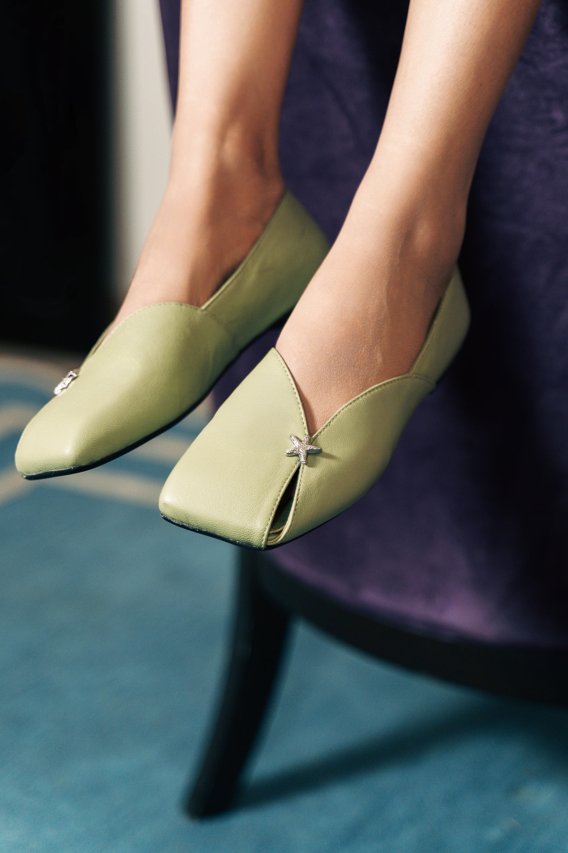 A Handcrafted square-toe flat in genuine pista green leather with a star fish pin detail. Understated but playful perfect for days that need a soft statement.